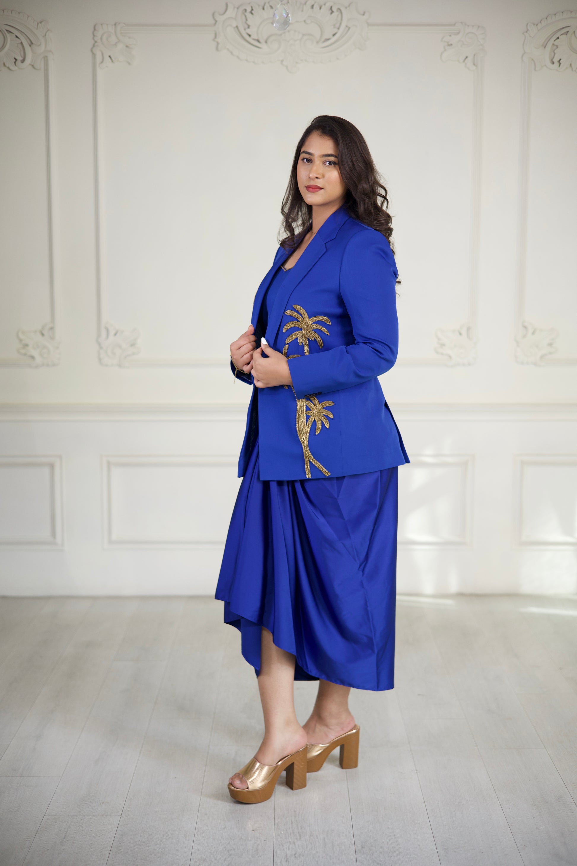 Step into elevated contemporary style with the Blue Palm Luxe Co-Ord Set, a striking ensemble crafted for the modern woman who loves statement fashion with effortless comfort. This cobalt-blue three-piece set features a structured embroidered blazer, a minimalist crop top, and a fluid draped skirt—creating a look that is both glamorous and gracefully relaxed. The golden palm-tree embroidery on the blazer adds a touch of luxury, making this outfit a true fusion of bold color, elegant detailing, and modern silhouettes. Perfect for festive gatherings, cocktail evenings, destination events, or any occasion where you want to stand out with refined confidence.